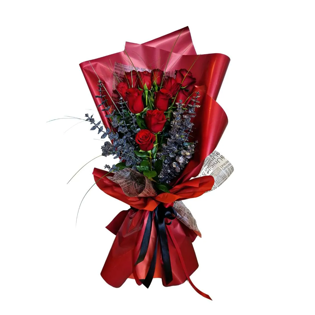 Ljubavni buket s crvenim ružama i tamnim detaljima je jednostavan, a tako poseban. Namijenjen je svim posebnim osobama koje želite iznenaditi.