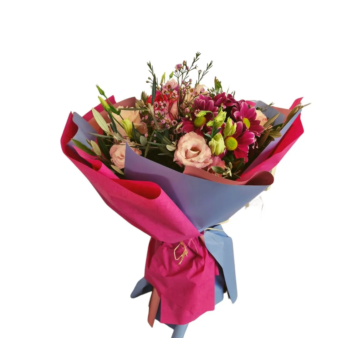 Ljupki buket u kombinaciji ružičaste i ljubičaste boje simbolizira veselje. Prigodan je kao poklon bilo da želite izraziti ljubav, zahvalnost ili poštovanje.