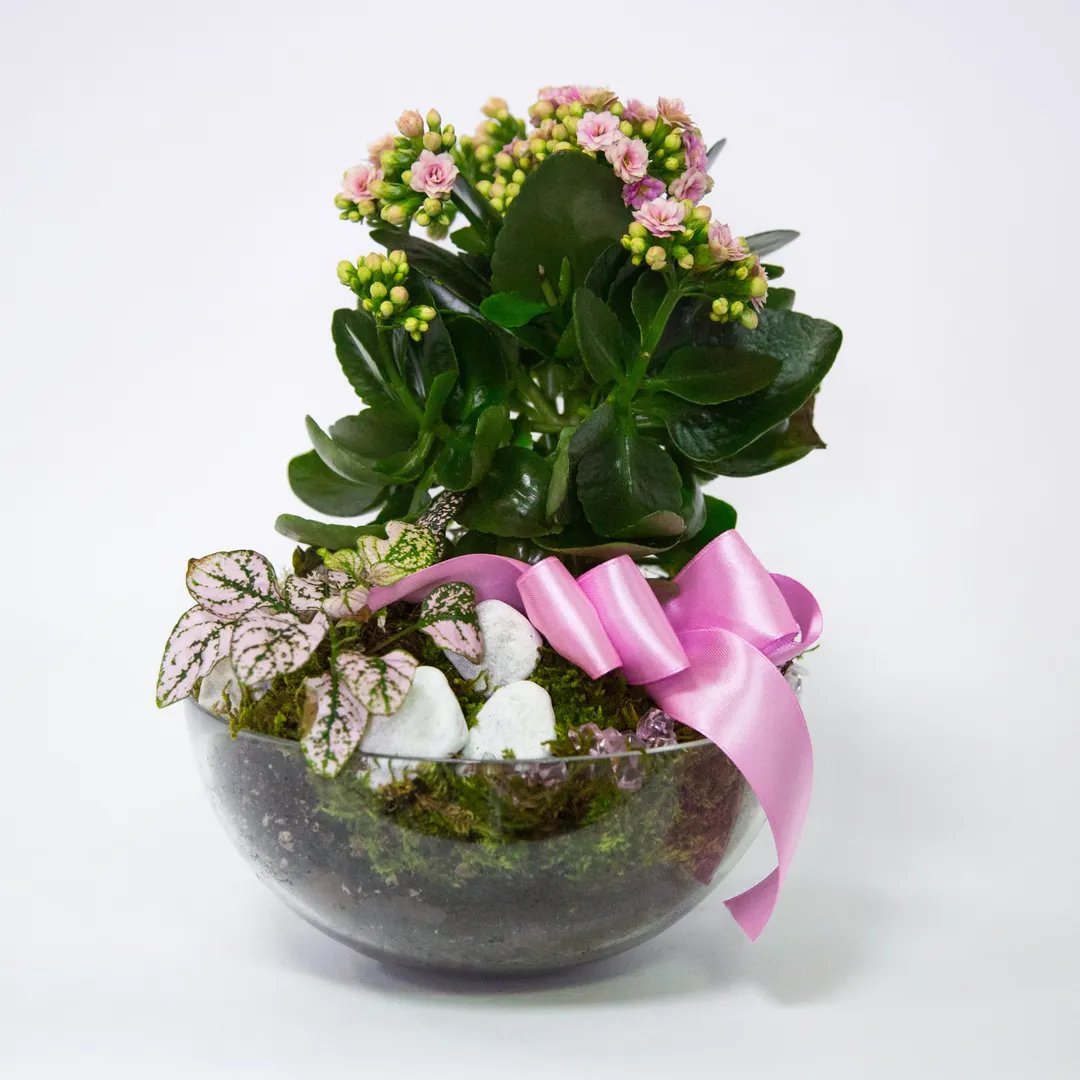 Lončanica u staklenoj vazi s ukrasnim pijeskom i dekoracijom.