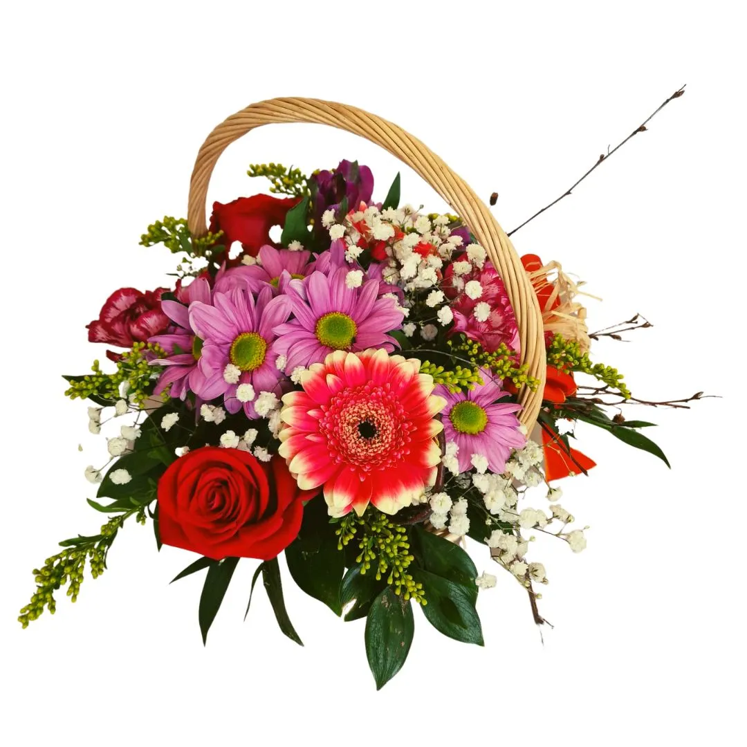 Šarena košarica izrađena je od najljepših cvjetova koji su pažljivo birani i složeni kako bi stvorili prekrasan i šarmantan aranžman. Jednostavna, a istovremeno elegantna, idealna je kao poklon za različite prigode.